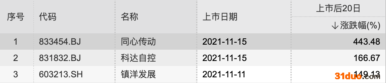 财联社12月14日讯,11月以来,新股市场回暖,多只新股上市后连收一字涨停板,富佳股份、镇洋发展、三羊马上市后一字板数量领先;北交所同心传动上市后20日涨幅达443%。