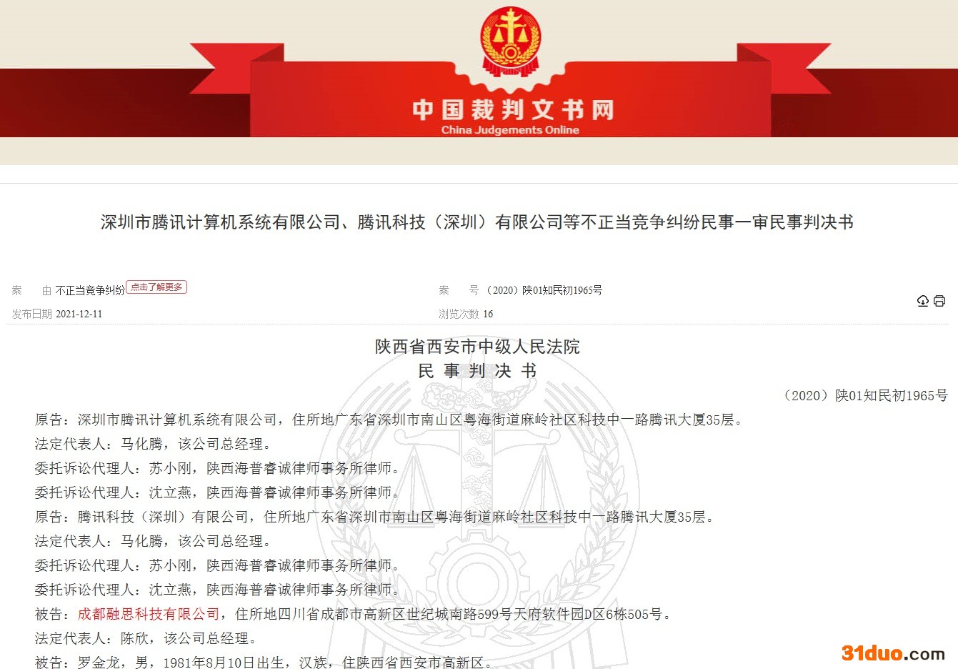 中新经纬12月14日电 据中国裁判文书网消息,近日,陕西省西安市中级人民法院公布《深圳市腾讯计算机系统有限公司、腾讯科技(深圳)有限公司等不正当竞争纠纷民事一审民事判决书》(简称:判决书)。判决书显示,融思公司赔偿腾讯计算机公司、腾讯科技公司经济损失50万元;罗金龙赔偿腾讯计算机公司、腾讯科技公司经济损失2万元。