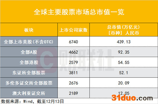 全球对比来看,美国股市市值排名第一,Wind数据显示,截至12月13日,全部美股上市公司总市值达到439.13万亿元,港股总市值为54.55万亿元,日本上市公司总市值达52.10万亿元,加拿大多伦多证交所总市值为20.09万亿元,澳大利亚证交所总市值为12.05万亿元。