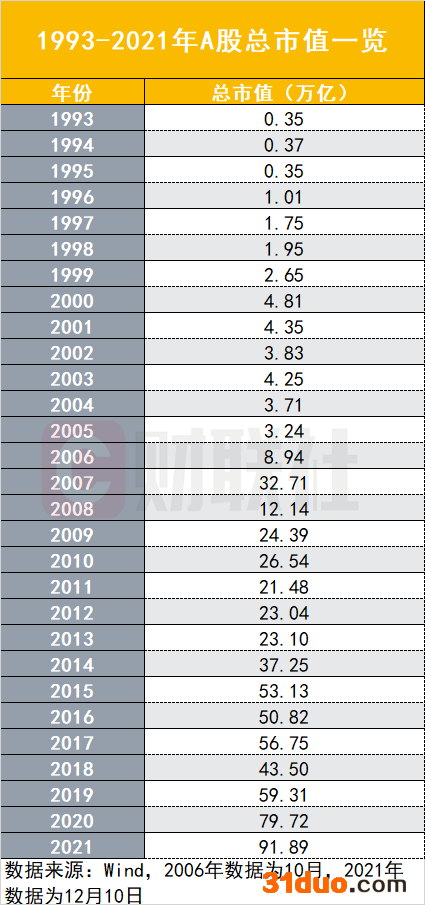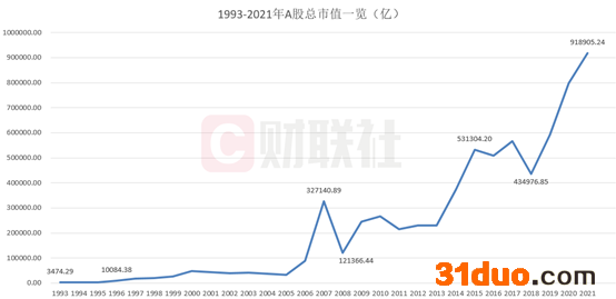 在开篇之年,A股全部上市公司总市值尚不足百亿,随后在1991年末突破百亿大关,1992年末突破千亿,直到1996年底,A股总市值冲破万亿大关。