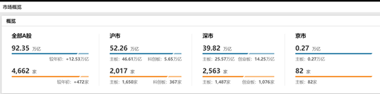 Wind数据显示,截至12月13日,A股上市公司总数为4662家,总市值达到92.35万亿元,较年初增长12.53万亿元。其中,深市总市值达39.82万亿元,沪市为52.26万亿元,北交所为0.27万亿元。其首次站上90万亿大关,是在年初。
