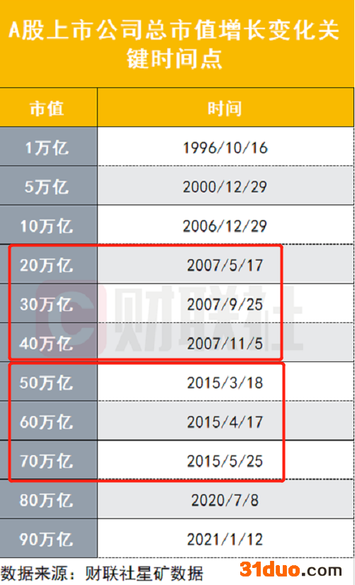 30年间,A股市值的攀升速度也成倍速增长,其背后有多重影响因素,除市场扩容、制度完善外,更离不开行情驱动。A股总市值实现第一个“10万亿”的时间为16年(1990-2006年),实现第二个“10万亿”仅花了半年时间(2006.12-2007.5)。2007年行情助推下,A股总市值连上三级台阶,接连突破20、30、40万亿市值大关;同理,2015年上半年A股一路高歌猛进,总市值站上50万亿后,又陆续攻克60、70万亿大关。
