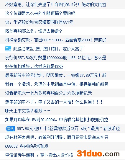 12月7日,禾迈股份披露发行公告,557.8元/股的发行价“轰动”市场,禾迈股份因此被称为“最贵新股”。有网友表示,“罕见!就是中签了,我也交不起。”“一个小公司口气这么大,上来就要几十亿”。