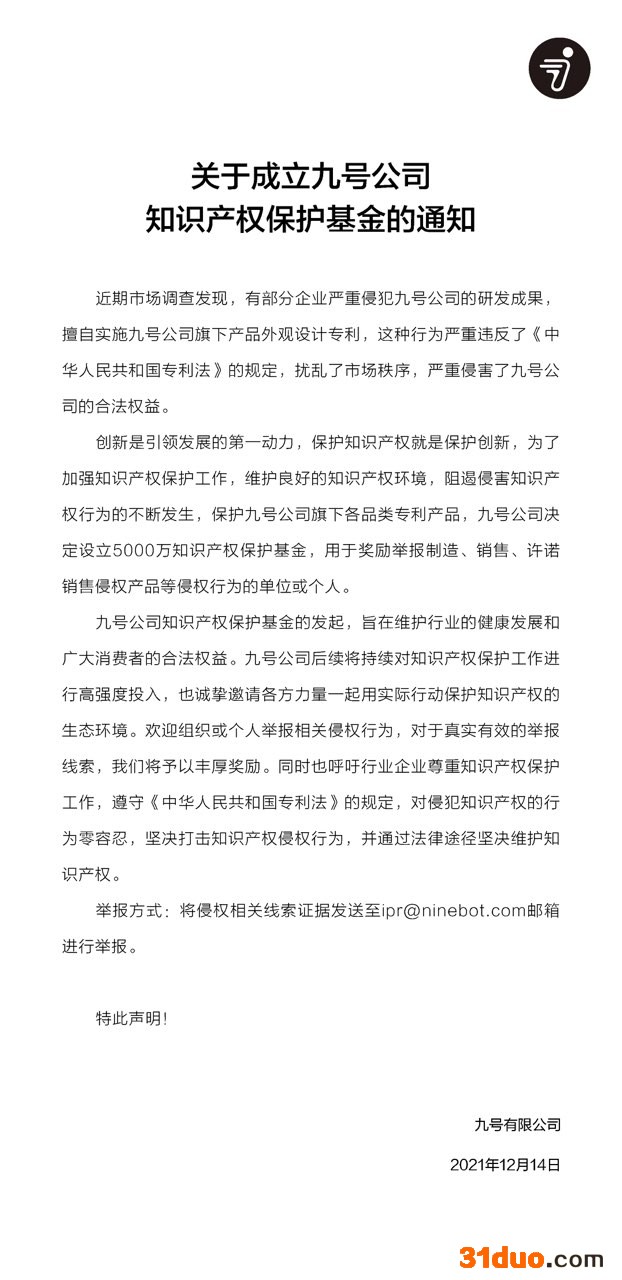 12月14日,九号公司设立5000万知识产权保护基金,用于奖励举报制造、销售、许诺销售侵权产品等侵权行为的单位或个人。