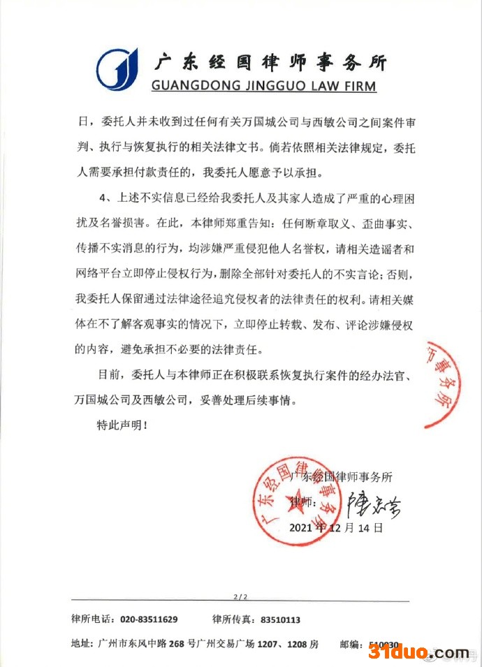 此外,声明还提到,林丹、谢杏芳并未收到过任何有关万国城公司与西敏公司之间案件审判、执行与恢复执行的相关法律文书。倘若依照相关法律规定,需要承担付款责任的,二人愿意予以承担。(中新经纬APP)