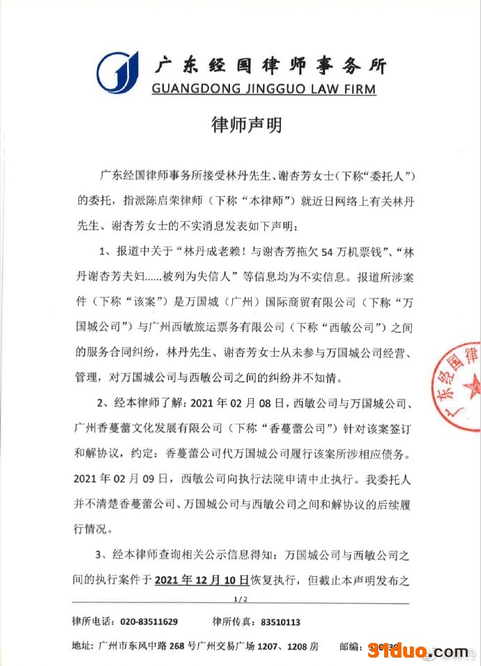 随后,林丹又在微博发布律师声明。其中提到,“林丹成老赖!与谢杏芳拖欠54万机票钱”“林丹谢杏芳夫妇……被列为失信人”等信息均为不实信息。报道所涉案件是万国城(广州)国际商贸有限公司与广州西敏旅运票务有限公司之间的服务合同纠纷,林丹、谢杏芳从未参与万国城公司经营、管理,对万国城公司与西敏公司之间的纠纷并不知情。