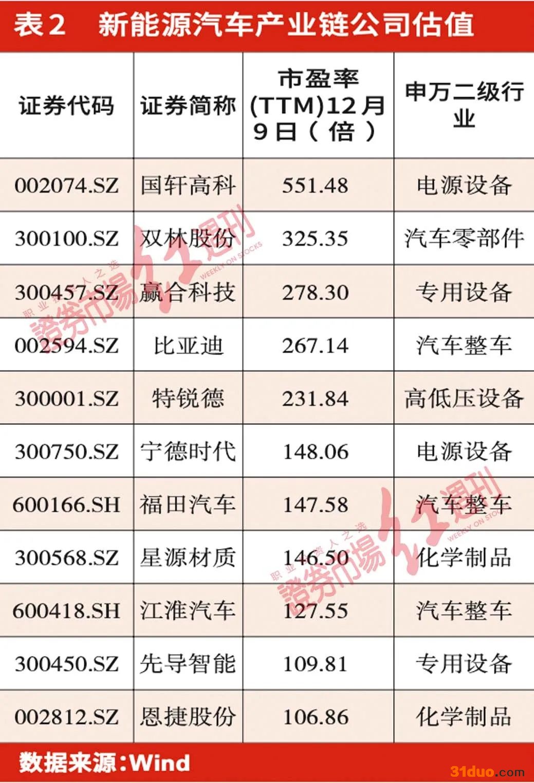 不过,新能源汽车产业链(含电池、材料、整车以及零部件等)整体估值水平达到了73.36倍,部分电池、材料、整车公司的估值水平则超过百倍(见表2)。对此,张可兴指出,要关注新能源汽车估值的“锚”,即特斯拉的走向。他说,“特斯拉的股价已经处在了一个相对高的位置。目前国内的新能源汽车的高估值现象未来可能难以持续,但相较于其他行业而言,由于本身具备较高的成长性,新能源汽车产业链继续维持在一个相对较高的估值水平也具有相对合理性。”