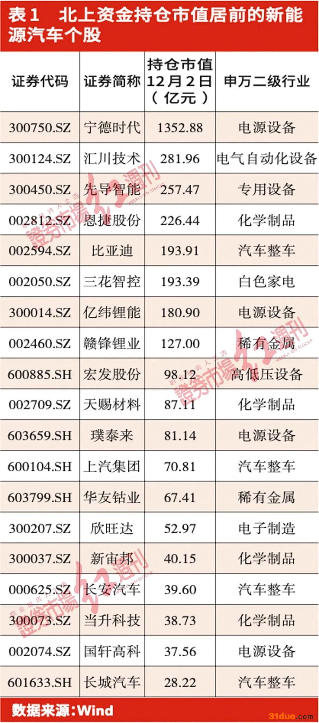 据《红周刊》记者统计,北上资金近期持仓新能源汽车产业链市值已经超过食品饮料,成为其“第一重仓”板块。以截至12月2日的统计数据显示,北上资金持仓新能源汽车产业链的市值为3668亿元,超过食品饮料的3636亿元市值水平。