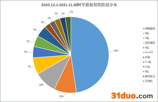 统计范围内,阿里公开披露的股权投资事件共42起,同比增长23.53%。其中,48%为战略融资,近2成为境外投资,主要集中在新加坡、印尼和越南等东南亚国家。