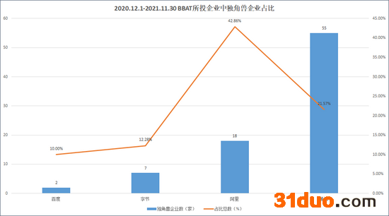 据不完全统计,虽然腾讯投资的独角兽企业数量最多,但阿里被投企业中独角兽占比最高,超4成企业投后估值已突破10亿美元。