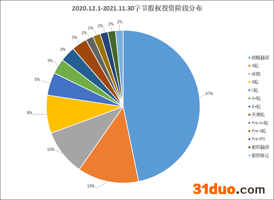 统计范围内,字节公开披露的股权投资事件共62起,同比增长40.91%。其中,47%为战略融资,10%为并购,尤为青睐消费升级和医疗健康领域,被投企业中有5家获得字节的两次投资。
