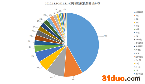统计范围内,腾讯公开披露的股权投资事件共265起,同比增长79.05%。其中,42%为战略融资,约18%为境外投资,主要集中在法国、芬兰、德国等欧洲国家以及日本、韩国、印度等亚洲国家,有12家企业在一年内获得腾讯两次投资。