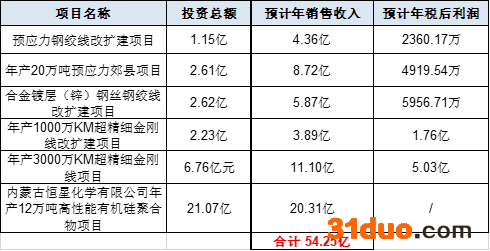 除了上一节讲到的公司豪掷21亿成立子公司恒星化学,打造年产12万吨高性能有机硅聚合物项目外,恒星科技近期还通过非公开发行股票方式募集6.38亿元,扣除发行费用后的募集资金净额将用于预应力钢绞线改扩建项目、年产20万吨预应力钢绞线项目、合金镀层(锌)钢丝钢绞线改扩建项目。