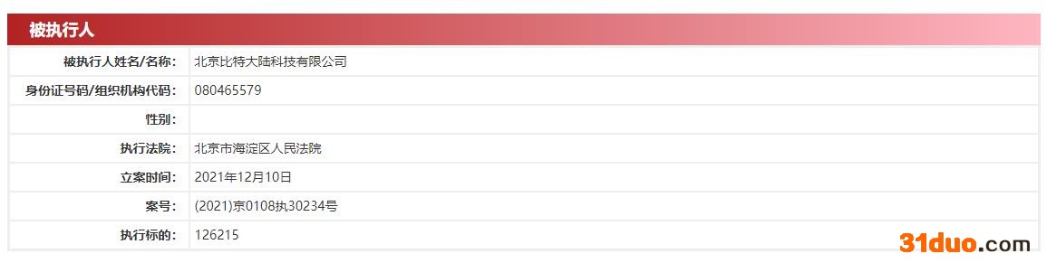 中国经济网北京12月14日讯 近日,执行信息公开网显示,北京比特大陆科技有限公司新增被执行人信息,案号(2021)京0108执30234号,执行标的12.62万元,立案日期为2021年12月10日,执行法院为北京市海淀区人民法院。