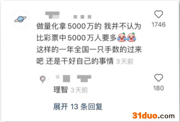 不过,也有网友“冷静”看待:“做量化拿5000万元的人,我并不认为比买彩票中5000万元的人要多,这样的人在全国一只手数得过来,还是干好自己的事情。”