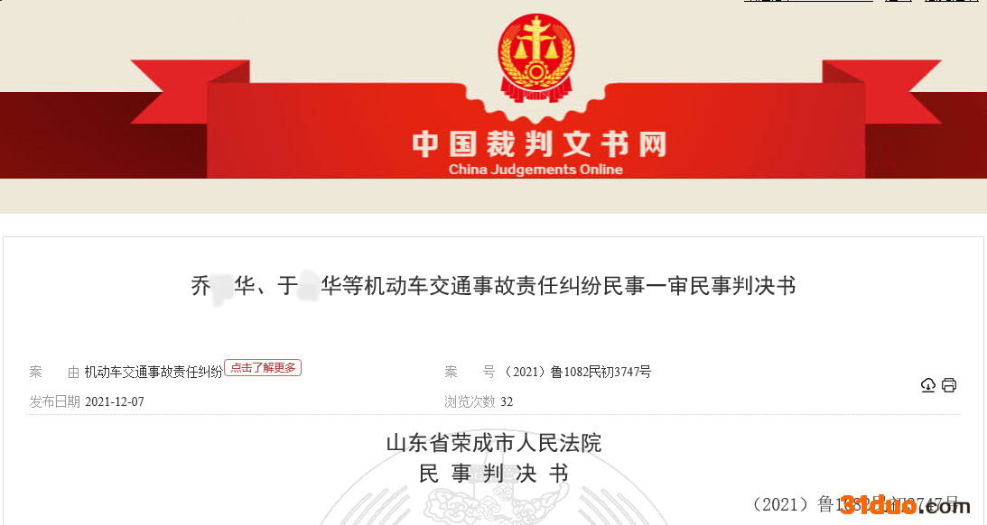 12月7日,中国裁判文书网公示了《乔某华、于某华等机动车交通事故责任纠纷民事一审民事判决书》((2021)鲁1082民初3747号),裁定书详细披露了本案的相关细节。