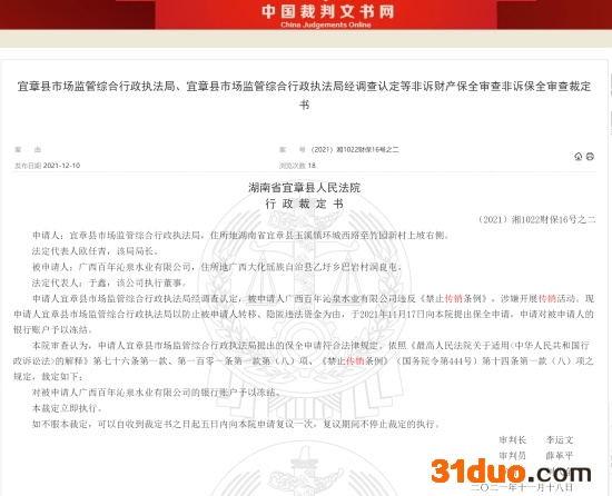 中国经济网北京12月14日讯 12月10日,裁判文书网公示的一则湖南省宜章县人民法院行政裁定书((2021)保16号之二)显示,申请人宜章县市场监管综合行政执法局经调查认定,被申请人广西百年沁泉水业有限公司违反《禁止传销条例》,涉嫌开展传销活动。现申请人宜章县市场监管综合行政执法局以防止被申请人转移、隐匿违法资金为由,于2021年11月17日向本院提出保全申请,申请对被申请人的银行账户予以冻结。
