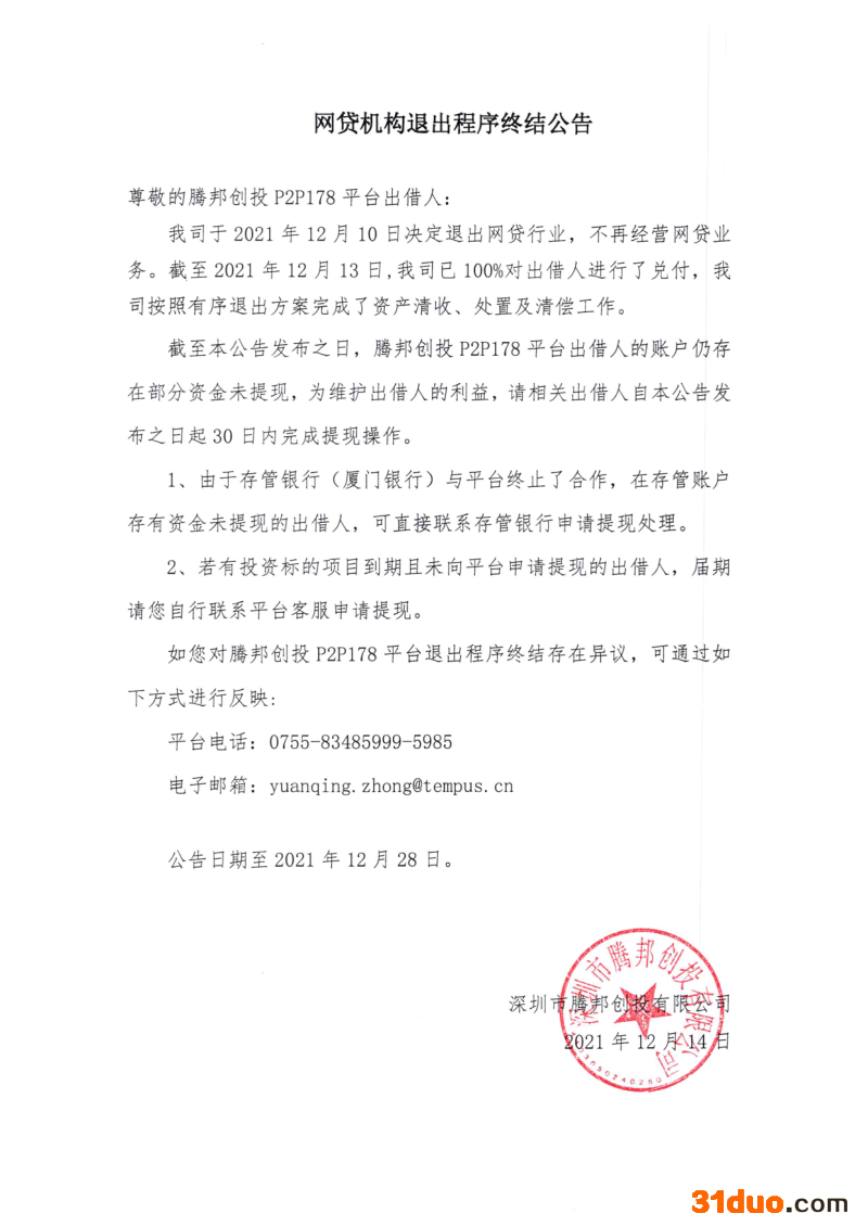 12月14日,*ST腾邦(300178.SZ)旗下P2P平台腾邦创投于公众号发布了退出程序终结公告。