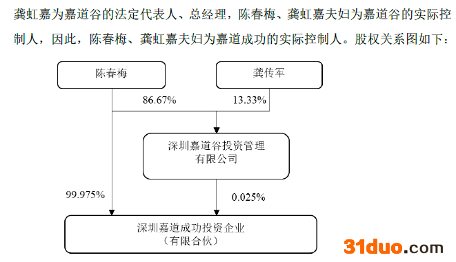 嘉道成功的合伙人为陈春梅和深圳嘉道谷投资管理有限公司(以下简称嘉道谷),陈春梅出资39.99亿元,出资比例为99.975%,是有限合伙人;嘉道谷出资100万元,出资比例为0.025%,是普通合伙人。而嘉道谷又由陈春梅持有86.67%的份额,龚虹嘉则为嘉道谷的法定代表人、总经理。陈春梅、龚虹嘉夫妇二人为嘉道谷的实控人,因此,陈春梅、龚虹嘉夫妇为嘉道成功的实控人。
