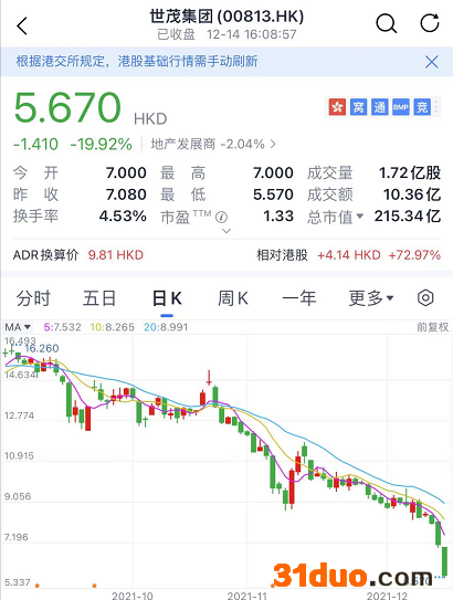 14日,世茂集团继续下跌,盘中最低至5.66港元,最高跌幅为20.1%,股价刷新近9年最低点。包括“20世茂G4”“20世茂G2”“19世茂G3”在内的多只债券跌幅触发临停。