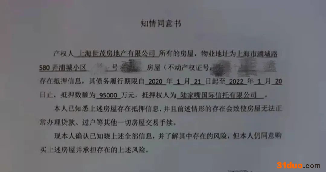 业主在签合同的时候,被告知需在知情同意书上签字,这时候大家才知道,浦城小区房源被抵押的消息。