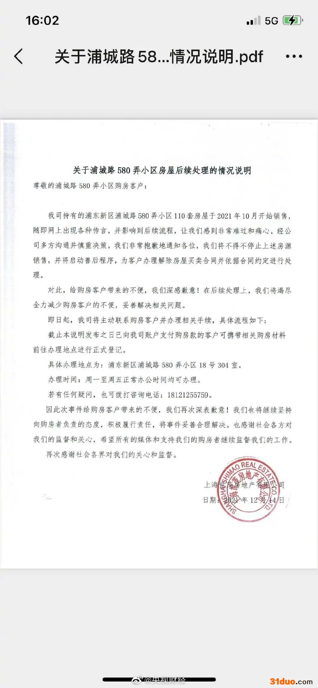 至于为何最终选择全部退房,世茂称,公司所持有的浦东新区浦城路580弄小区110套房屋,于2021年10月开始销售,随即网上出现各种传言,并影响到后续流程,让世茂感到非常难过和痛心。经世茂多方沟通并慎重决策,非常抱歉地通知浦城路580弄小区购房客户,不得不停止上述房源销售,并将启动善后程序,为客户办理解除房屋买卖合同并依据合同约定进行处理,对给购房客户带来的不便深感歉意。