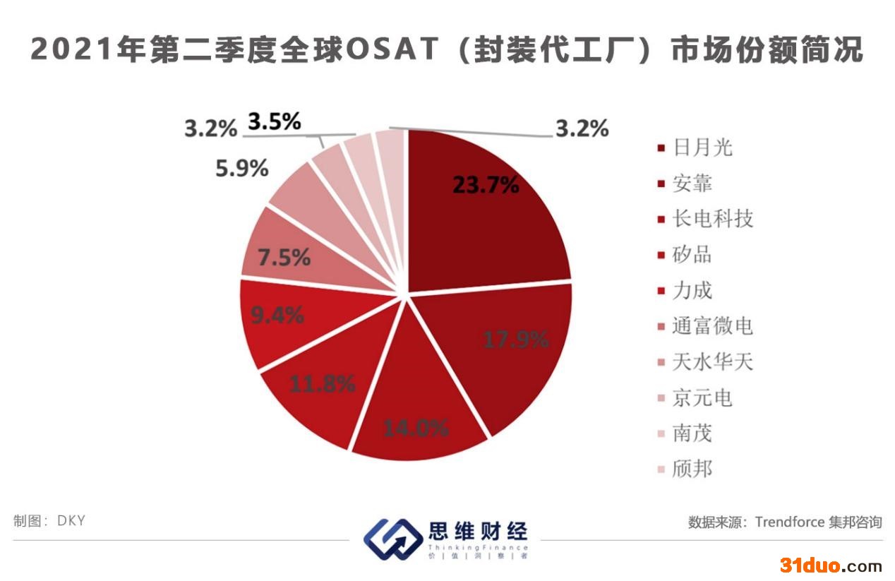 在封测厂商市场份额排名方面,根据Trendforce集邦咨询报告,2021第二季度,日月光作为全球龙头销售收入占据了23.7%的市场份额,其次是安靠(Amkor),占比17.9%,通富微电则以7.5%的市场份额,排名第六。