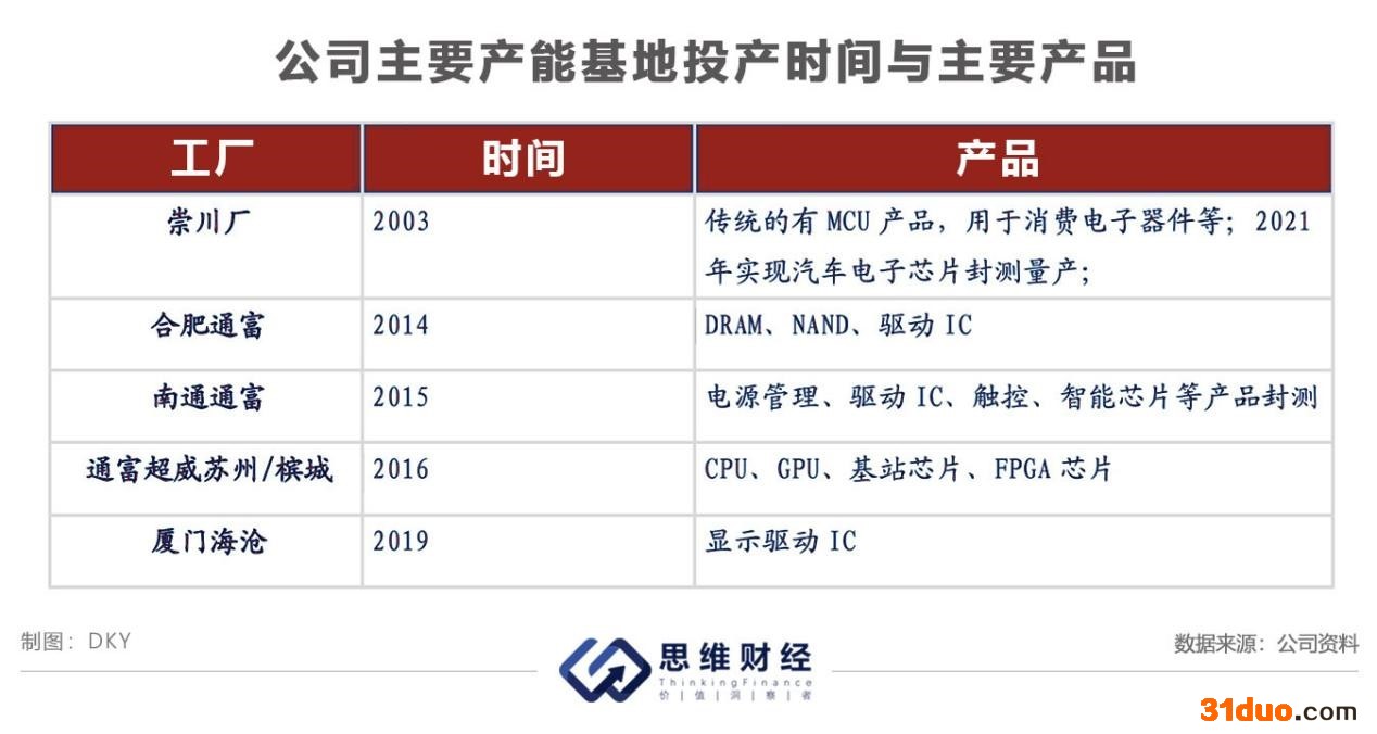 目前,公司拥有崇川、苏州、槟城、苏通、合肥、厦门六大生产基地。其中,崇川厂、合肥通富、南通通富以传统的MCU、驱动IC封测为主。崇川厂在2021年实现了汽车电子芯片的封测量产,知名半导体分析机构Yole 预计,汽车封装市场规模将由2018年的51亿美元增长至2024年的90亿美元,年复合增长率为10%,基于新能源汽车的蓬勃发展,公司的传统封装业务有望持续受益。