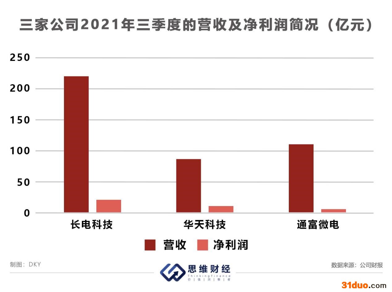 公司的业务较为聚焦,超98%的营收均来源于封装测试业务。2021年三季度,通富微电营收112亿元,同比增51%,净利润为7亿元,同比增168%。对比长电科技及华天科技,公司的营收规模尚可,但净利润则相对最低。