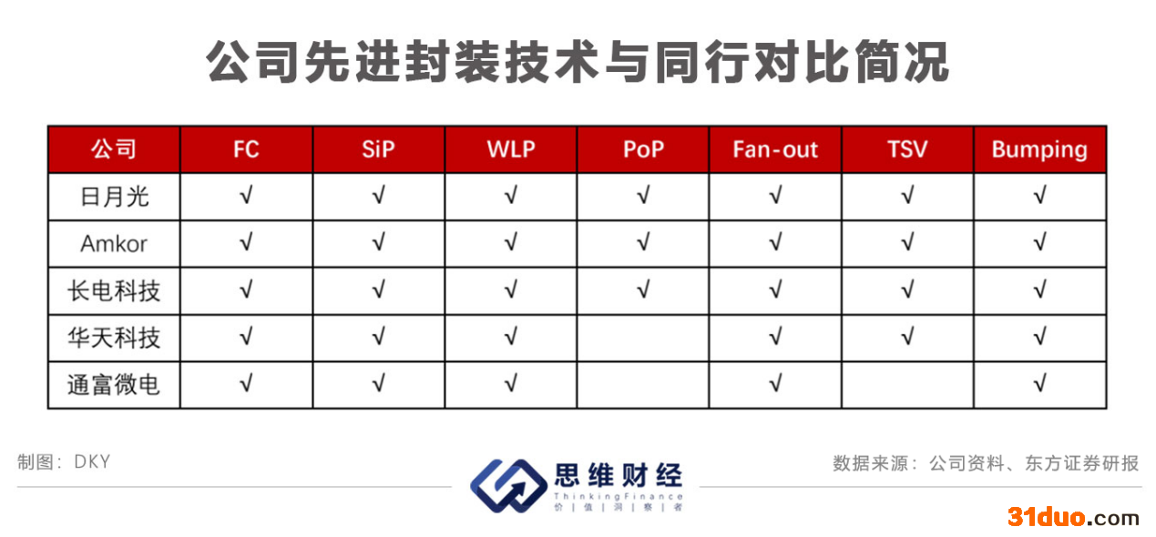在先进封装技术方面,对比日月光、安靠(Amkor)、长电科技、华天科技,公司在PoP(堆叠封装)及TSV(硅通孔封装技术)上有所缺失。