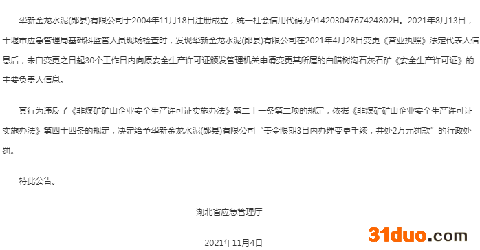 中国经济网北京12月15日讯 (记者 张海蛟) 近日,湖北省应急管理厅网站发布公告称,对华新金龙水泥(郧县)有限公司(以下简称:“华新金龙水泥”)违反《非煤矿矿山企业安全生产许可证实施办法》的违规行为,作出行政处罚,责令限期3日内办理变更手续,并处2万元罚款。记者查询发现,华新金龙水泥为华新水泥股份有限公司(以下简称:“华新水泥”,股票代码:600801.SH)旗下子公司。