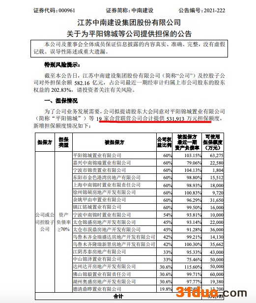 公告中,中南建设称,公司拟提请股东大会同意对平阳锦城置业有限公司等19家合营联营公司合计提供531,913万元担保额度,为全资子公司武汉锦苑中南房地产开发有限公司提供3,000万元担保额度。