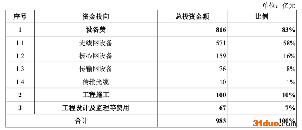 根据招股书,5G精品网络项目建设期2年(2021年-2022年),将新建5G基站不少于50万个;建设5G SA核心网及网络云资源池,可满足3.5亿5G SA用户业务需求及0.2亿行业用户需求。其中,项目的设备费预计投入813亿元,占比高达81%。