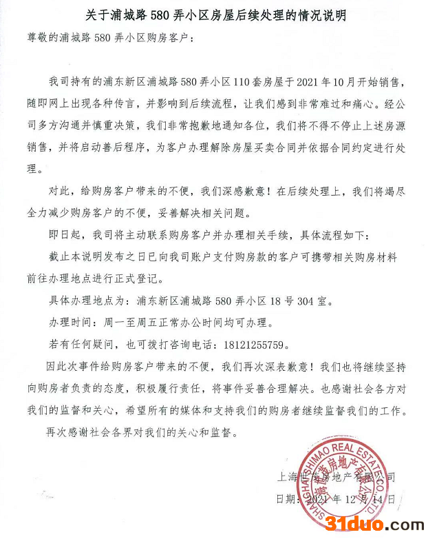 12月14日,上海世茂发布《关于浦城路580弄小区房屋后续处理的情况说明》表示,“由于此前出现各种传言,让我们感到非常难过和痛心。经公司多方沟通并慎重决策,我们非常抱歉地通知各位,我们将不得不停止上述房源销售,并将启动善后程序,为客户办理解除房屋买卖合同并依据合同约定进行处理。”