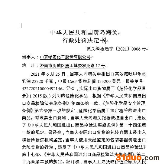 比如,2021年8月31日,因“未依法将出口危险化学品报经海关检验”和“使用未经出入境检验检疫机构鉴定的出口危险货物包装容器”两项违法行为,山东绿霸分别被海关部门处以罚款69000元,合计138000元。