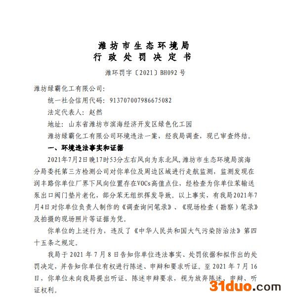 2021年7月16日,因环境污染,潍坊绿霸化工有限公司(下称“潍坊绿霸”)被当地环保部门处以罚款42500元。