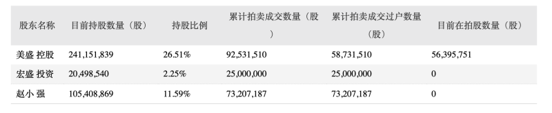 控股股东的资金危机显而易见但也显然不止于此。除了被限制消费,在9月末时,赵小强、美盛集团及宏盛投资所持有的全部美盛文化股权均已经被质押冻结。并且其中部分股权从8月就开始被进行公开拍卖,据最新进展显示,截至公告日,美盛控股及一致行动人累计被拍卖过户的股份数量约为1.57亿股。