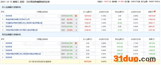 中国经济网北京12月15日讯 今日,迪阿股份(301177.SZ)因属于无价格涨跌幅限制的证券而登上龙虎榜。迪阿股份收报165.01元,涨幅41.18%,成交额38.03亿元,换手率66.95%,振幅17.11%,总市值660.06亿元。