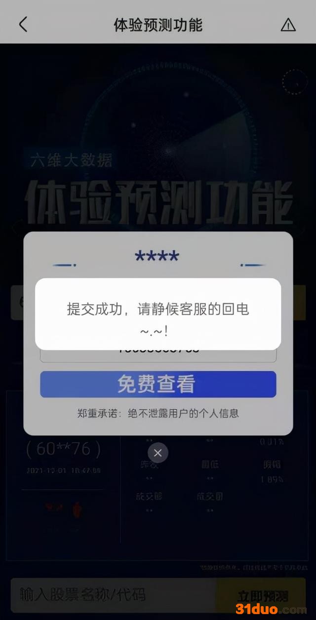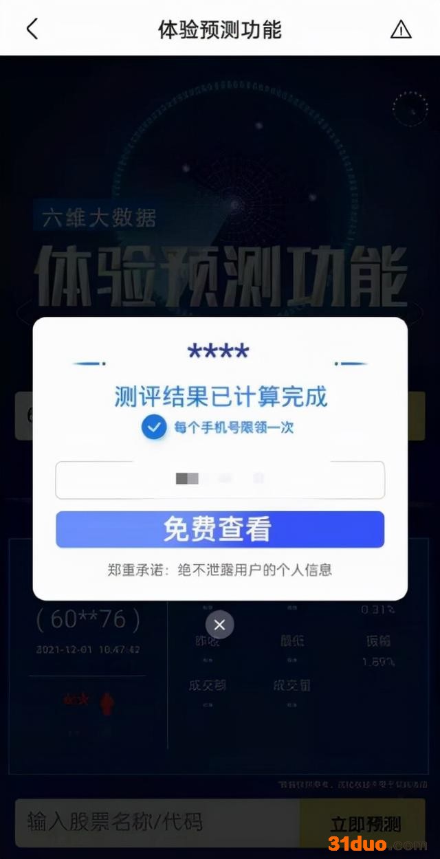 而在输入股票代码完毕后,点击立即预测,却又跳转出需要填写手机号码的输入框,并且显示“测评结果已计算完成,每个手机号限领一次”。此外,需引起注意的是,在免费查看按钮下方有一排小字标识着“郑重承诺,绝不泄露用户的个人信息”。但记者在填写手机号码诊断股票后,后面几天不断接到声称是证券机构、投顾机构的电话。