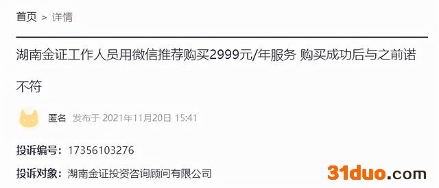 而值得注意的是,后续提供免费诊股服务的却是湖南金证投资咨询顾问有限公司(以下简称“湖南金证”)。资料显示,其和盈亚证券一样属于湖南省本地企业,也是持牌的投顾机构。同时,记者注意到,在当地的湘问·投诉直通车平台上有不少关于湖南金证的投诉。