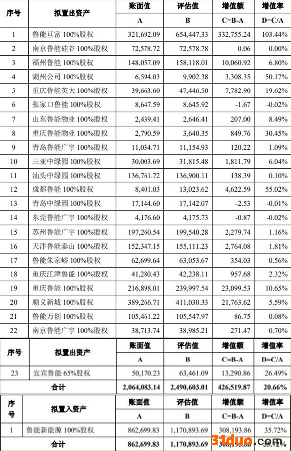 本次交易的评估基准日为2021年8月31日,根据中企华出具的置出资产评估报告和置入资产评估报告,置出资产(23家子公司股权)合计交易对价为249.06亿元。置入资产(鲁能新能源100%股权)交易对价为117.09亿元。