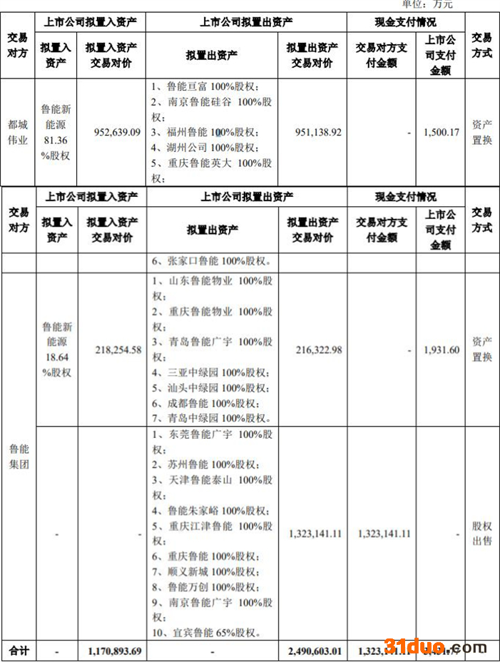 报告书显示,本次交易中的置出资产为广宇发展所持全部23家子公司股权,置入资产为交易对方鲁能集团与都城伟业合计持有的鲁能新能源(集团)有限公司(简称“鲁能新能源”)100%股权,估值差额部分以现金方式补足。鲁能集团有限公司(简称“鲁能集团”)已实施对鲁能新能源的增资而持有其18.64%股权,都城伟业集团有限公司(简称“都城伟业”)持有鲁能新能源81.36%股权。其中,广宇发展13家子公司股权与鲁能集团与都城伟业合计持有的鲁能新能源100%股权置换,其余10家子公司股权现金出售给鲁能集团。本次交易完成后,广宇发展将持有鲁能新能源 100%股权。本次交易构成重大资产重组且构成关联交易,不构成重组上市,独立财务顾问为中信证券股份有限公司(“中信证券”,600030.SH)。