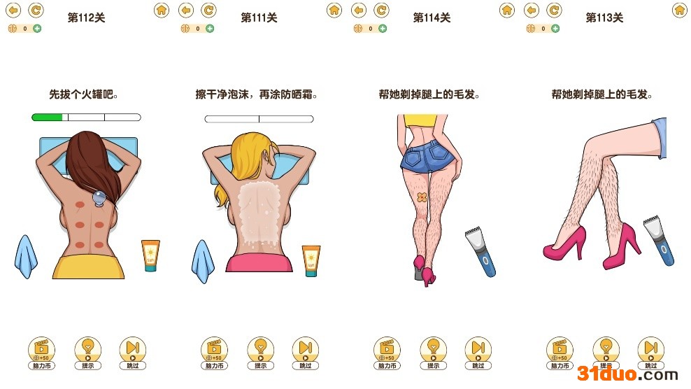 此外,凤凰网《风暴眼》测试发现,上述类型内容在该游戏中多次出现,且有接连多个关卡为同主题内容的现象,如测试到的第113-115关均为“为女生刮腿毛”这一内容,不同的只在于,女生体型以及细节如创可贴的设置。此外,还有“亲吻小姐姐”的游戏内容,仅需要挪动道具到女性形象嘴部,而在往后3道关卡中,均为更换了女性形象的同类内容。这些并不需要智力的关卡内容,似乎是以“益智”为名“夹带私货”,而无论从答题难度还是画面设计上来看,对一般成年用户的吸引力也是有限的。