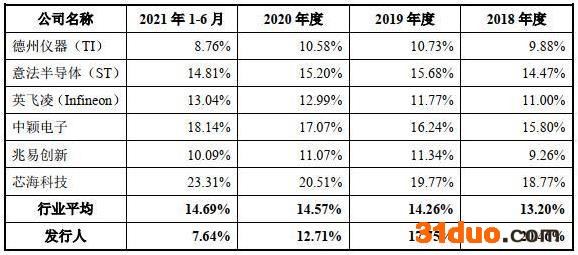 报告期内,峰岹科技的研发费用率分别为20.46%、17.75%、12.71%以及7.64%,研发费用率降幅较大,且近两年研发费用率显著低于行业平均水平。数据显示,2021年1—6月行业平均研发费用率为14.69%,高出峰岹科技七个百分点。
