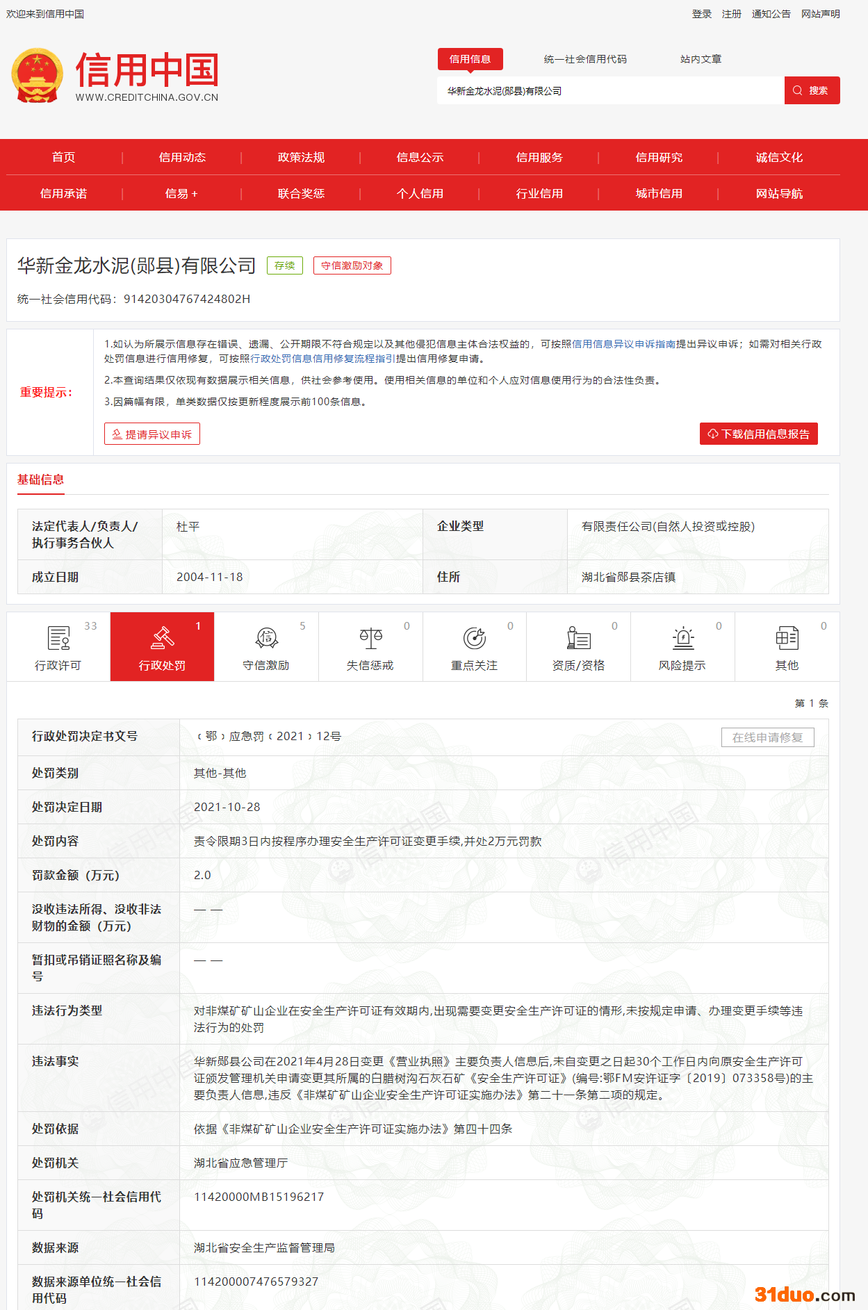 中国网财经12月15日讯 据信用中国网站消息,近日,湖北省应急管理厅网站发布公告称,对华新金龙水泥(郧县)有限公司(以下简称:“华新金龙水泥”)违反《非煤矿矿山企业安全生产许可证实施办法》的违规行为,作出行政处罚,责令限期3日内办理变更手续,并处2万元罚款。据企查查信息显示,华新金龙水泥为华新水泥股份有限公司(以下简称:“华新水泥”)旗下子公司。