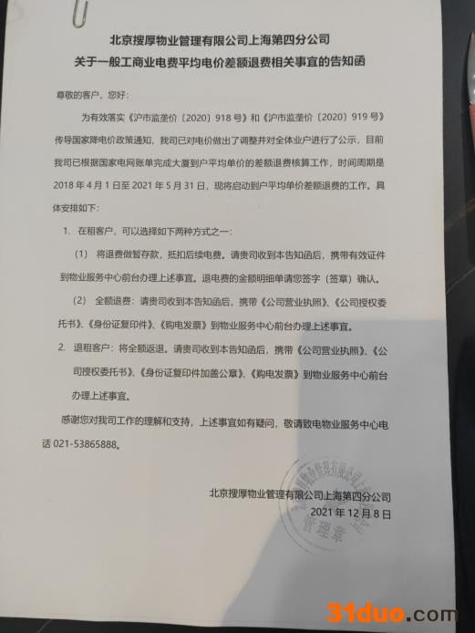 根据商户提供的一份北京搜厚物业管理有限公司上海第四分公司关于一般工商业电费平均电价差额退费相关事宜的告知函显示,为有效落实《沪市监垄价(2020)918号》和《沪市监垄价(2020)919号》传导国家降电价政策通知,搜厚物业对电价做出了调整并对全体业户进行公示,目前根据国家电网账单完成大厦到户平均单价的差额退费核算工作,时间周期是2018年4月1日至2021年5月31日,将启动到户平均单价差额退费工作。