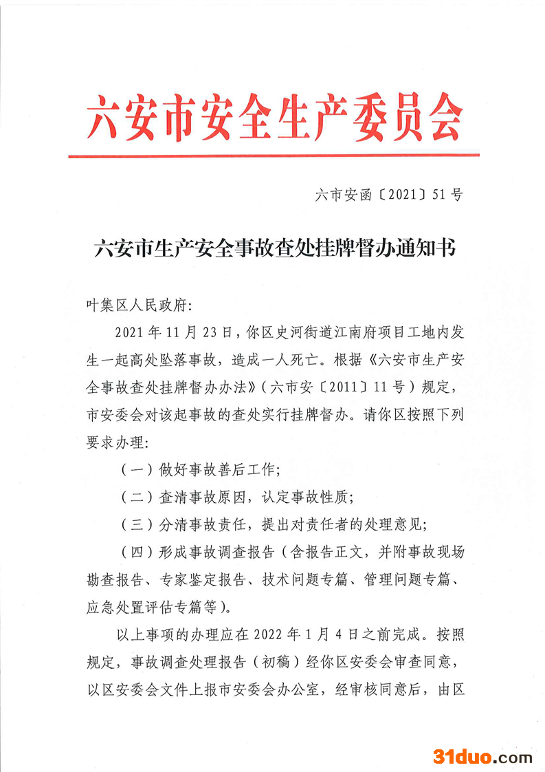 《事故通知》中,六安市安全生产委员会指出,2021年11月23日,叶集区史河街道江南府项目工地内发生一起高处坠落事故,造成一人死亡。根据《六安市安全生产事故查处挂牌督办办法》(六市安【2021】11号)规定,市安委会对该起事故的查处实行挂牌督办。要求叶集区按照相关要求予办理。