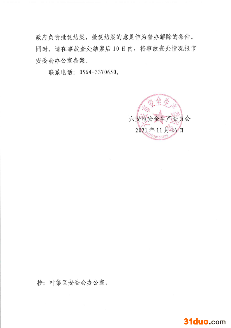 此外,《事故通知》中六安市安全生产委员会要求应在2022年1月4日前完成办理。经审核后,由区政府负责批复结案,批复结案的意见作为督办的解除条件。同时,在事故查处结案10日内,将事故查处情况报市安委会办公室备案。