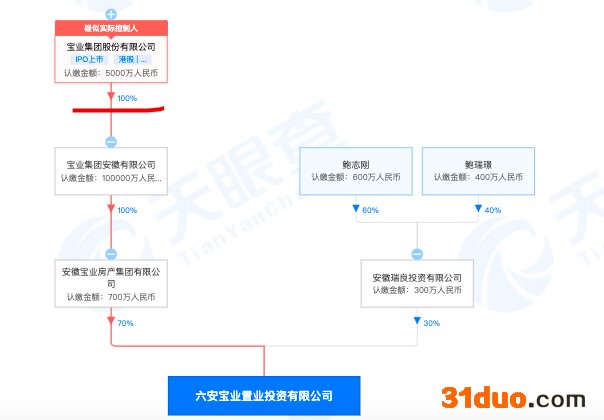 而从天眼查查询了解到,透过穿透股权关系,六安宝业置业投资有限公司是港股宝业集团股份有限公司(简称:宝业集团)间接控股70%的子公司。