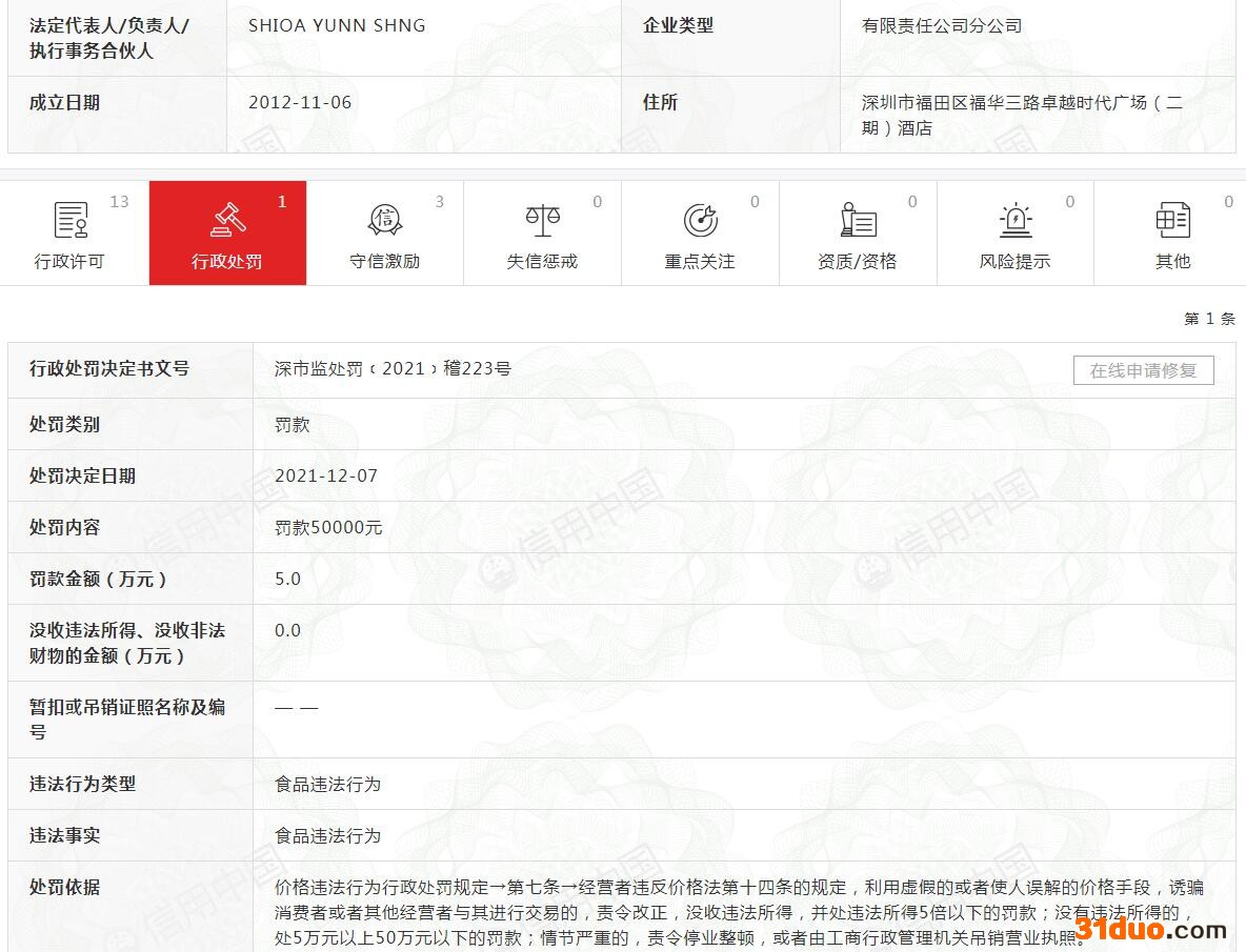 中新经纬12月15日电 据信用中国网站消息,近日,深圳卓越酒店管理有限公司四季酒店被深圳市市场监管局罚款5万元,违法行为类型为“食品违法行为”,处罚决定日期为2021年12月7日。